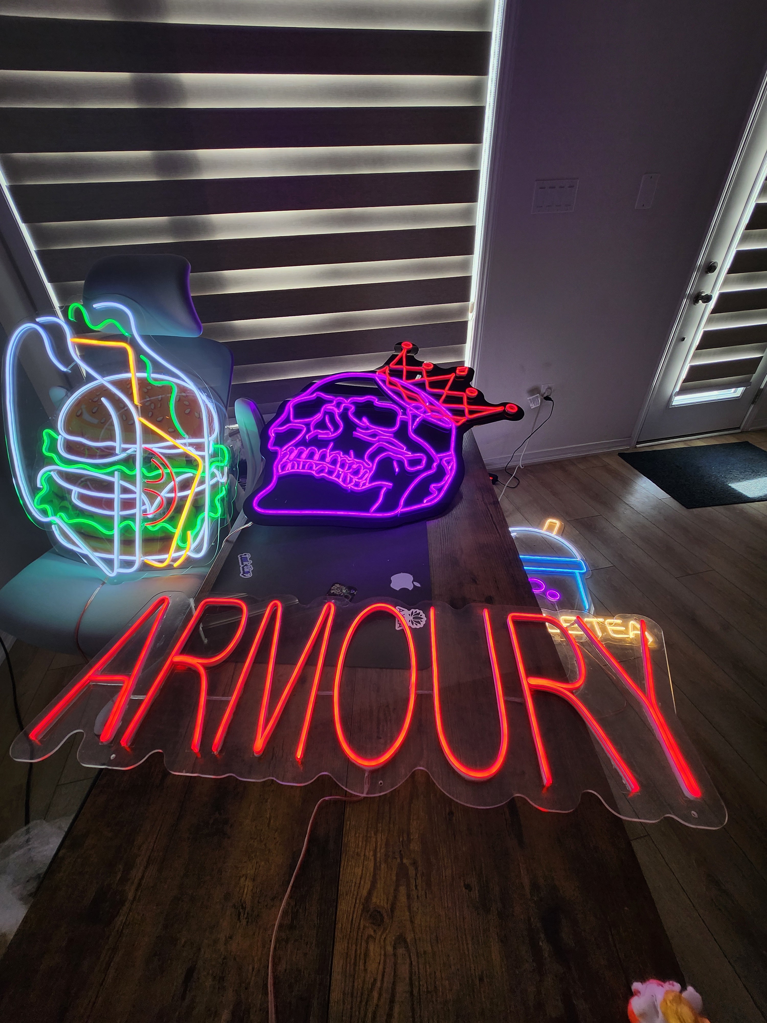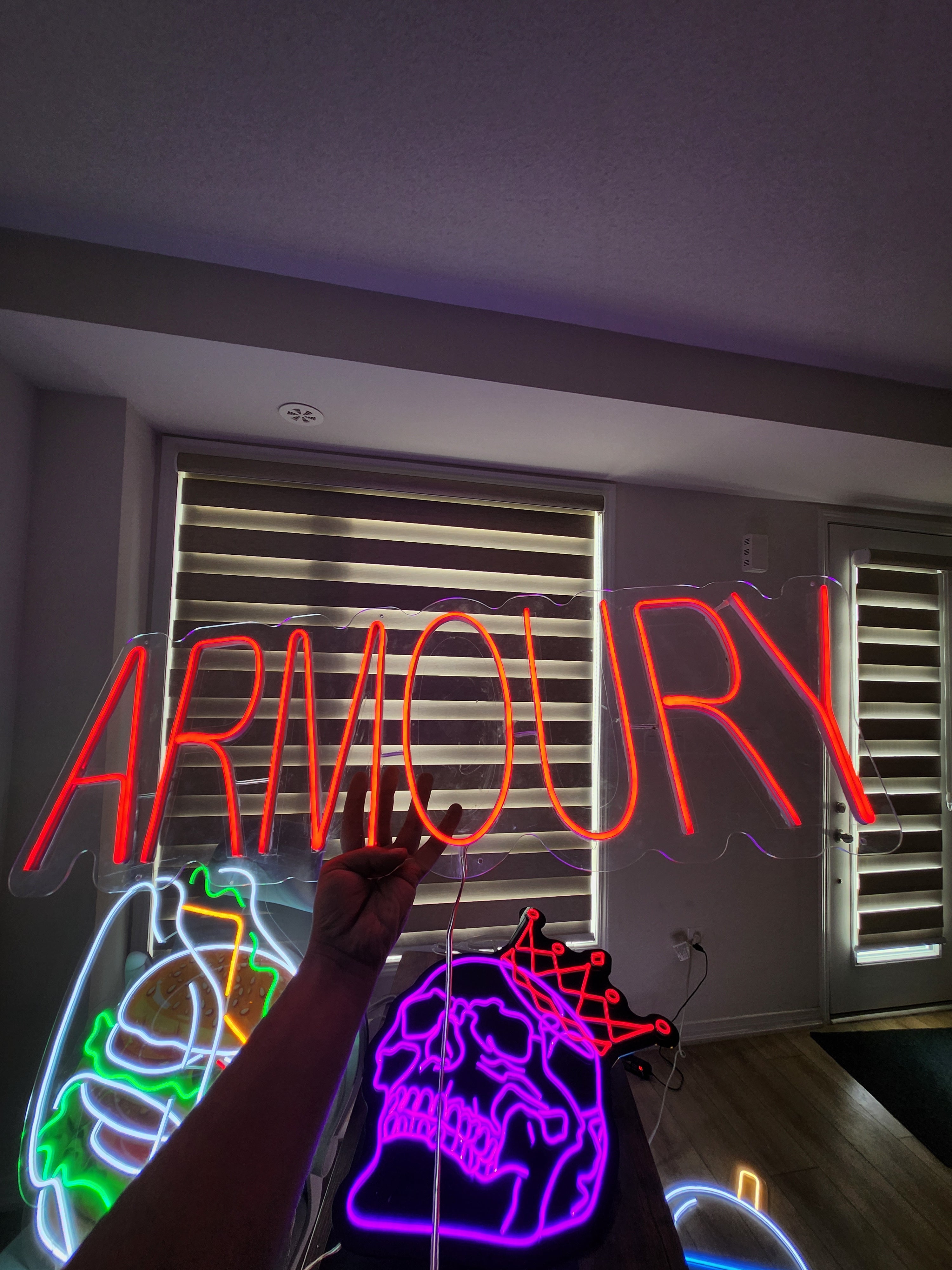 Illuminate your armoury with a striking statement using our Armoury Neon Sign! Crafted with bold neon lights, this sign adds an undeniable allure to your establishment, drawing in enthusiasts and collectors alike. Whether you specialize in historical weaponry, modern firearms, or fantasy replicas, our Armoury Neon Sign sets the stage for an immersive experience. With easy installation and durable construction, it's the perfect addition to any man cave, gun shop, or historical museum. Make a lasting impression and light up your armoury with brilliance - shop now and arm yourself with style!